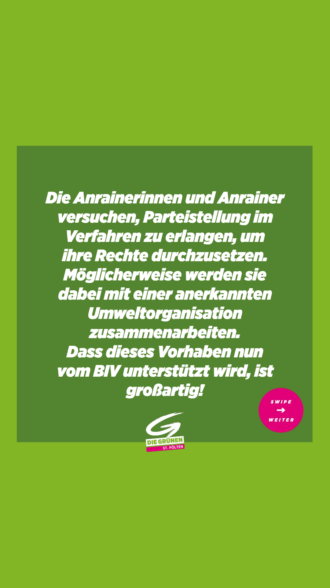 „Die Durchsetzung von Rechten erfordert einerseits viel Ausdauer, kostet andererseits aber auch Geld. Daher haben wir grüne Mandatarinnen und Mandatare auf Bundesebene selbst dazu verpflichtet, Teile unserer Gehälter dem BIV zur Verfügung zu stellen. Mit diesem Geld können Verfahren wie jetzt hier in St. Pölten ganz konkret unterstützt werden“.