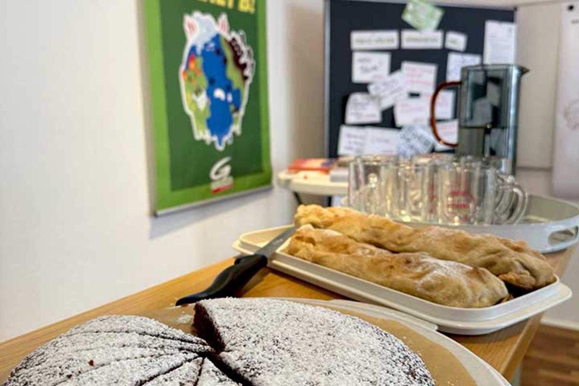 Für Leseratten gab es eine feine Auswahl an Büchern zur freien Entnahme. Hier wurde nach Lust und Laune gustiert und so manche mitgebrachten Bücher wechselten den Besitzer / die Besitzerin. Das neue Format fand regen Anklang, genauso wie die Zimtschnecken und der vegane Schokokuchen und Apfelstrudel.