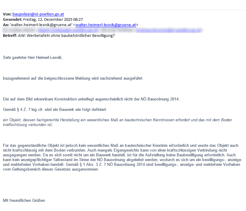 Die Baupolizei informierte am 30.10.2025 die Parteien schriftlich darüber, dass das Aufstellen von Werbeeinrichtungen außerhalb eines klar definierten Zeitraumes rund um Wahlen laut NÖ Bauordnung §14 Z 2 als Errichtung einer baulichen Anlage zu werten sei: „Diesbezüglich ist bei der Baubehörde um entsprechende Baubewilligung anzusuchen.“
