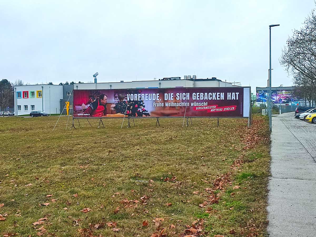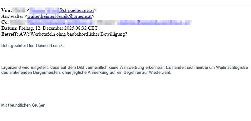 Wir informierten die Baupolizei über das vorzeitige aufstellen der SPÖ-Werbetafeln am 10. Dezember. 2 Tage später erklärt uns die Baupolizei, die Plakate seien keine Bauwerke und daher weder bewilligungspflichtig, noch unterliegen sie der Bauordnung. Gleichzeitig übernimmt sie die Argumentation der SPÖ und schreibt, es sei „vermeintlich keine Wahlwerbung erkennbar“, es handle sich um „Weihnachtsgrüße des amtierenden Bürgermeisters“.