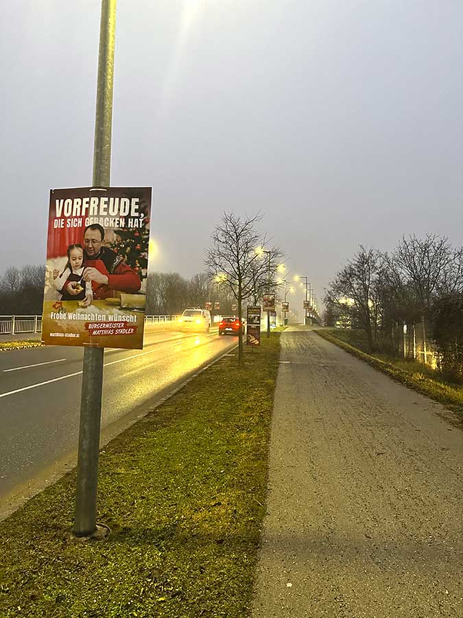 An Brücken, Straßenzügen und Lichtmasten hängen dutzendfach identische Sujets des SPÖ-Bürgermeisters – ohne Impressum, mit direktem Link zur Parteiwebsite und klar erkennbarer Wahlwerbebotschaft. Was als „Fairnessabkommen“ verkauft wird, entpuppt sich als einseitige Einschränkung aller anderen.