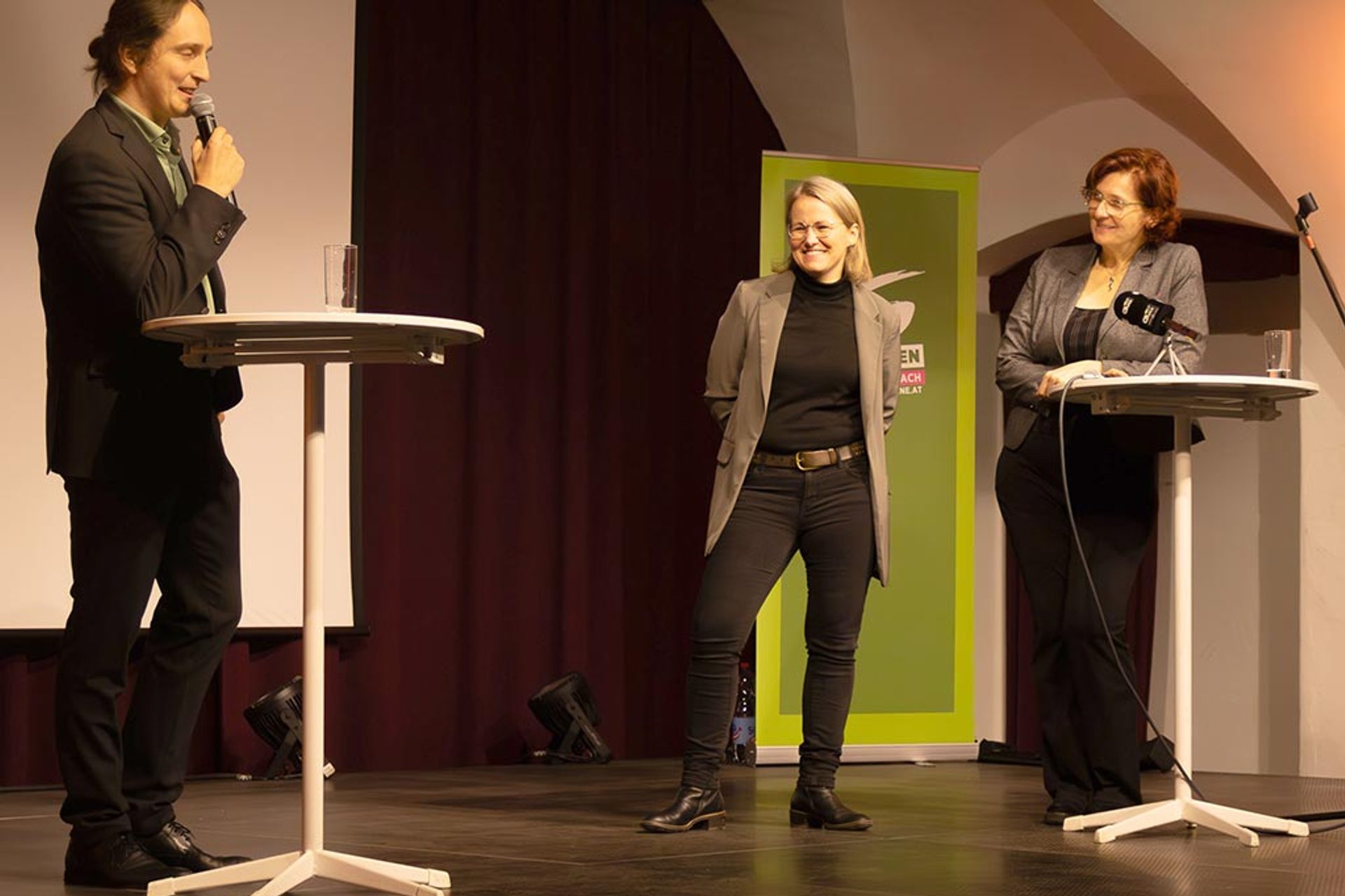 Im Anschluss an den Vortrag gab es eine lebhafte Diskussion mit Dr.in Stagl und Neulengbachs grünem Vizebürgermeister Paul Mühlbauer. Mühlbauer skizzierte konkrete lokale Initiativen, die den Ansatz des sozial-ökologischen Wirtschaftens greifbar machen: von der Gründung von Energiegemeinschaften und der Förderung aktiver Mobilität bis hin zur Einführung von Community Nurses und zukunftsgerichteten Konzepten zur Zentrumsgestaltung.