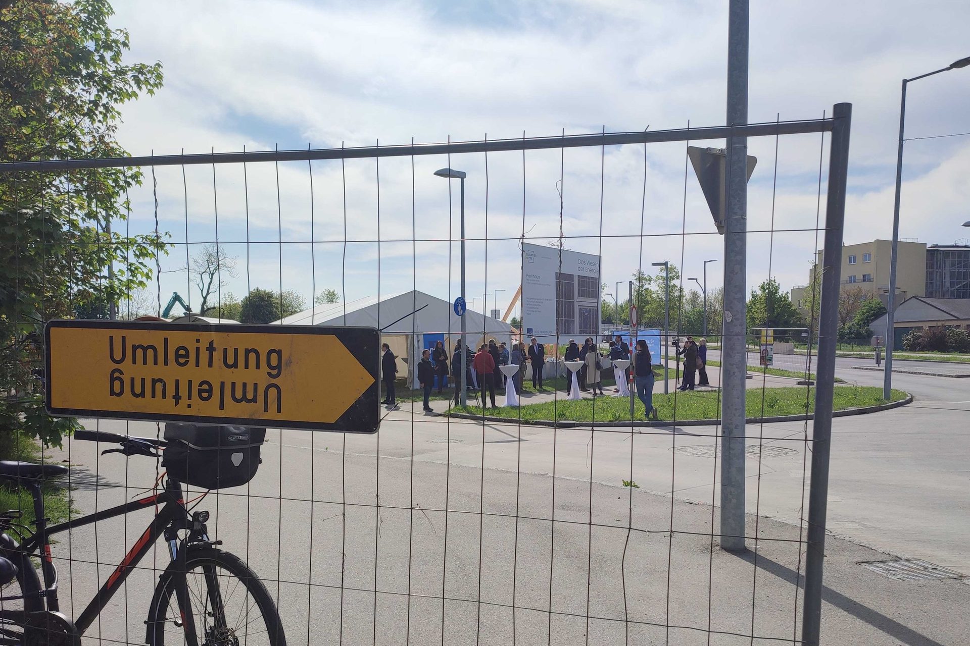 Bei der Spatenstichfeier am Dienstag, den 9. Mai war auch eine kleine Abordnung der St. Pöltner Grünen anwesend, um wenigstens mit einem Transparent “Grün statt Beton” darauf hinzuweisen, dass neue Autostellplätze nicht zur angeblich verfolgten Klimastrategie passen. Prompt wurde uns vom Projektbetreiber angedroht, dass er “sofort einschreiten” würde, wenn wir seine Veranstaltung in irgendeiner Weise stören würden (dabei wollten wir uns gar nirgends festkleben) und aufgefordert, “sein Grundstück” zu verlassen – wir mussten also auf den öffentlichen Radweg ausweichen.