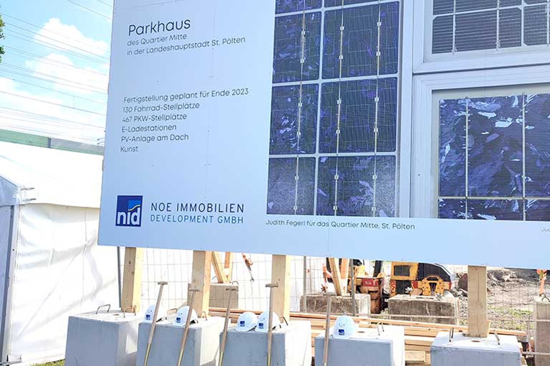In einem mehrstöckigen, 17 Meter(!) hohen Parkhaus sollen an der Willi-Gruber-Straße x Austraße über 460 neue PKW-Stellplätze entstehen – laut Projektbetreiber NOE IMMOBILIEN DEVELOPMENT GMBH “um Parken für die Bewohner / Nutzer des Quartier Mitte, für Beschäftigte im Umfeld des Projekts, für Anrainer oder auch für Pendler zu ermöglichen”.